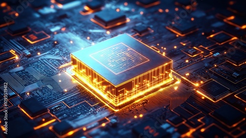 Futuristic glowing CPU on circuit board. Powerful processing unit. Quantum tech. AI circuitry. Innovative data processing. High tech innovation. Advanced computing. Advanced microchip. Future tech.