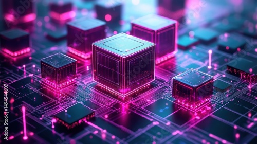Futuristic glowing cubes on a circuit board.