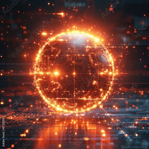 Futuristic glowing globe with data network, symbolizing digital technology and global communication in a high-tech environment.