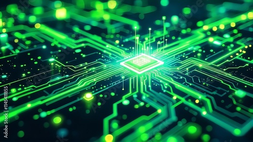 Futuristic green circuit board with data streams, symbolizing advanced technology, digital connectivity, and high-speed data processing in a high-tech, virtual environment.