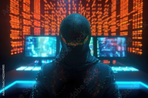 futuristic hacker guard working on computer. blurred background with lights, Generative AI