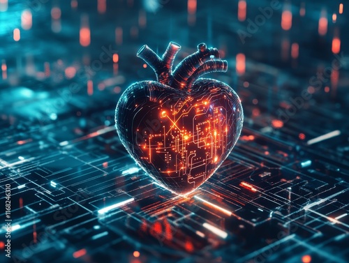 Futuristic Heart with Circuit Patterns in Digital Landscape