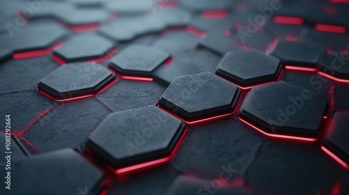 Futuristic Hexagonal Pattern with Glowing Red Edges on Dark Textured Surface for Modern Design Concepts and Tech Backgrounds