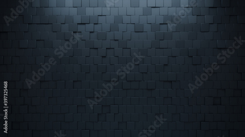 Futuristic, High Tech, dark background, with an offset square block structure. Wall texture with a 3D cube tile pattern. 3D render