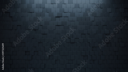 Futuristic, High Tech, dark background, with an offset square block structure. Wall texture with a 3D cube tile pattern. 3D render