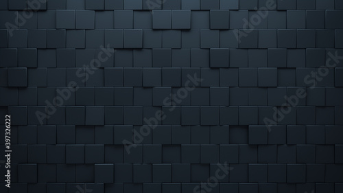 Futuristic, High Tech, dark background, with an offset square block structure. Wall texture with a 3D cube tile pattern. 3D render