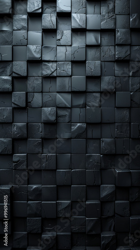 Futuristic High-Tech Wall with 3D Cube Tile Pattern in Dark Background, Unique Square Block Structure for Modern Architecture and Design Concepts