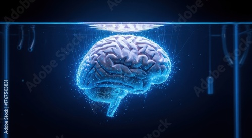 Futuristic Holographic Brain Scan Illuminates Neural Network in Dark, Sci-Fi Laboratory Setting.