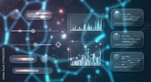 Futuristic hud interface elements with data visualization and control panels on a glowing network background