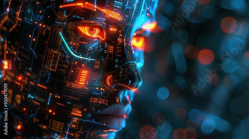Futuristic humanoid face with glowing circuitry, representing advanced technology and artificial intelligence.
