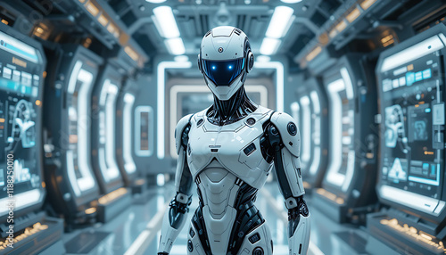 Futuristic Humanoid Robot in High-Tech Corridor with Advanced Technology.