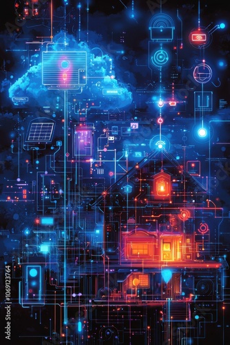 Futuristic illustration of smart home with digital network connections