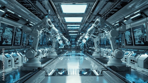 Futuristic Industrial Robot Arm Manufacturing Facility Interior Design