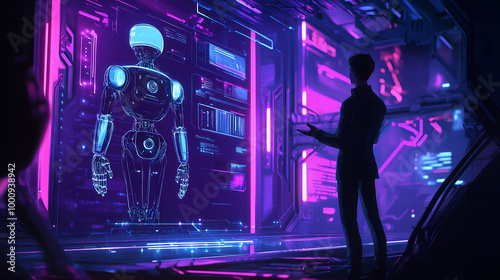 Futuristic Interaction: A Human and Robotic AI Conversing in a Transformative Technological Landscape, Showcasing Advanced Interfaces and Machine Learning Concepts