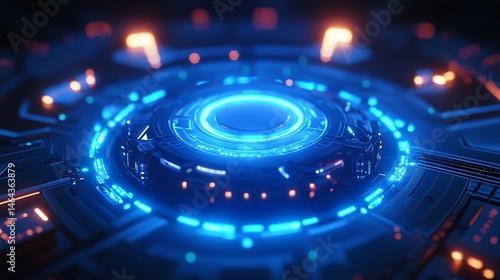 Futuristic interface design with glowing circular patterns and bright blue lights.