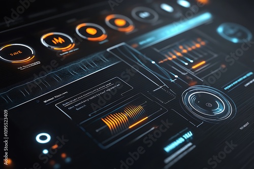 Futuristic interface displaying audio controls and visualizations.
