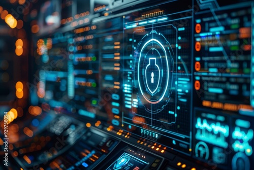 Futuristic interface displaying security features and data analytics.