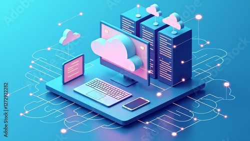 Futuristic Isometric Cloud Computing and Digital Connectivity – 3D Technology Illustration