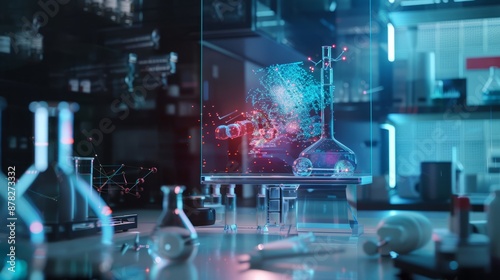 futuristic laboratory setting with a large holographic display projecting a 3D model of a complex algorithm or neural network