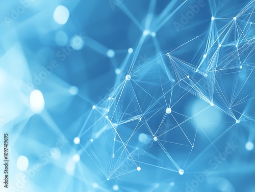 Futuristic low-poly geometric abstract design with blue wireframe and glowing orange network connections