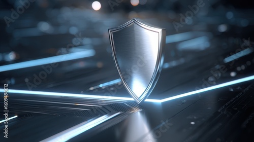 Futuristic Metal Shield Icon on a High Tech Digital Background Representing Cybersecurity and Data Protection