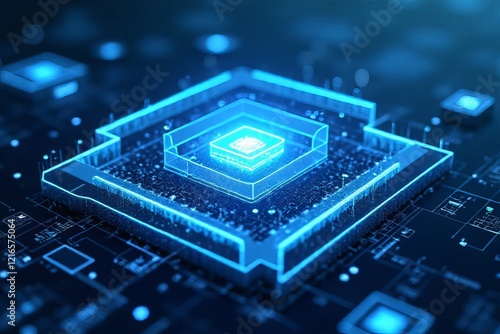 Futuristic microchip design with glowing blue elements on a dark background.