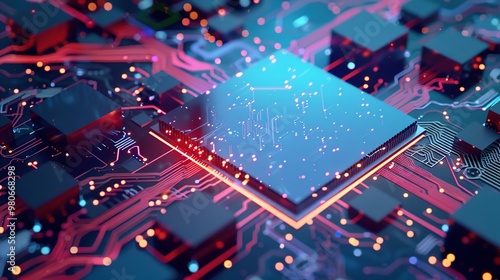 Futuristic microchip processor with lights on the blue background. Quantum computer, large data processing, database concept