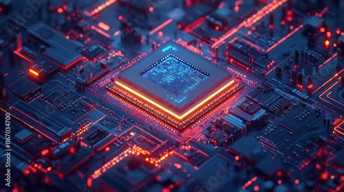 Futuristic microchip processor with lights on the blue background. Quantum computer; large data processing; database concept. CPU isometric banner. Central Computer Processors CPU concept Digital chip