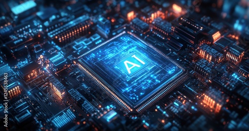 Futuristic Microchip with AI Integration Surrounded by Glowing Circuitry and Data Streams Representing Advanced Technology and Artificial Intelligence Innovation