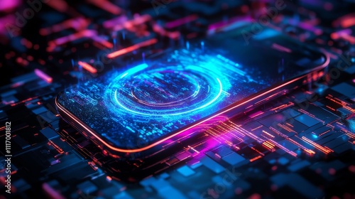 futuristic mobile showcase, advanced holographic ring platform, digital data overlay, glowing tech schematics, neon blue energy effects, binary code atmosphere, floating device display, technological