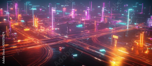 Futuristic neon city at night, glowing roads and skyscrapers.