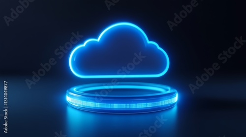 Futuristic Neon Cloud Icon on Glossy Surface with Glowing Blue Ring Highlighting Technology Concept