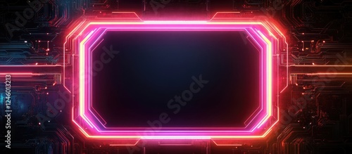 Futuristic neon cybernetic chip background with glowing frame and dark empty space for customizable text or graphic elements