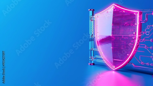Futuristic neon shield graphic on blue background, representing cybersecurity, data protection, and digital security.