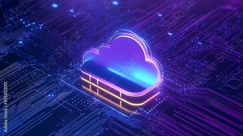 Futuristic neon-lit cloud computing technology concept on a digital circuit board background, symbolizing data storage and network security.