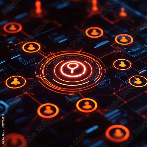 Futuristic Network Search Interface with User Icons. High-tech, glowing network interface showcasing a search function.