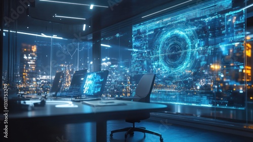 Futuristic Office Night View: Data Visualization on Giant Screen Displaying Cityscape