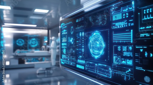Futuristic operating room with a large digital display showing medical data and a doctor in the background.