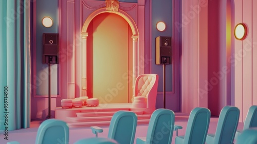 Futuristic Pink and Blue Neon Lit Minimalist Interior with Podium Steps