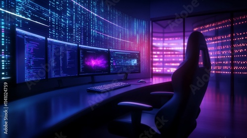 Futuristic programmer's workspace with multiple monitors displaying complex code and data visualizations in a modern, tech-driven environment.