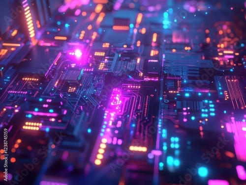futuristic quantum computing motherboard with holographic ai neural patterns, glowing circuit pathways in neon blue and purple, intricate nano-scale details with floating data fragments