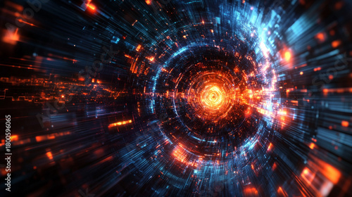 Futuristic quantum computing visualization featuring glowing qubits and entangled circuits. Neon light trails and abstract digital patterns convey advanced technology and computational complexity.