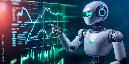 Futuristic Robot Analyzes Stock Market Data Trends on a Digital Screen with Precise Gestures.