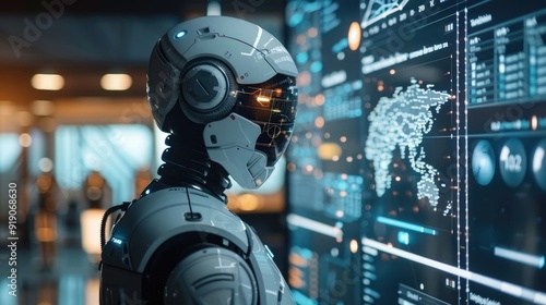 Futuristic robot analyzing data on a digital screen, representing AI technology and advanced computational capabilities.