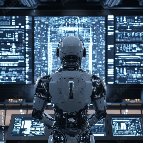 Futuristic Robot Analyzing Data on High-Tech Computer Display