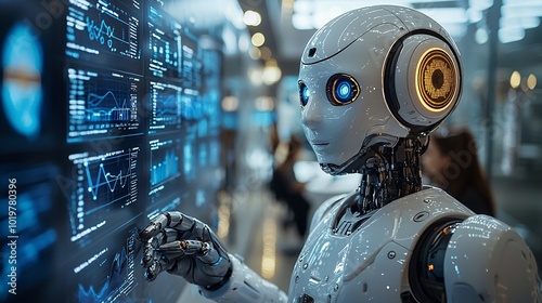 Futuristic Robot Analyzing Data on Touchscreen Display