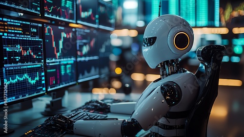 Futuristic robot analyzing financial data on multiple screens in a high-tech environment.