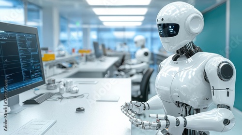 Futuristic robot assisting in a modern office environment.