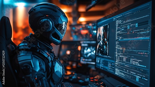 Futuristic Robot at Computer with Complex Data Display on Screen