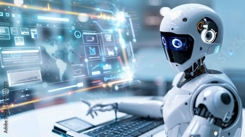 Futuristic robot interacting with computer interface and digital data display.